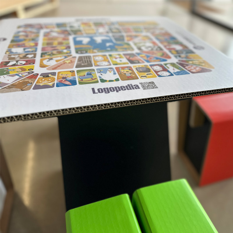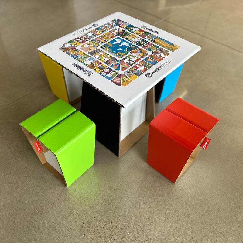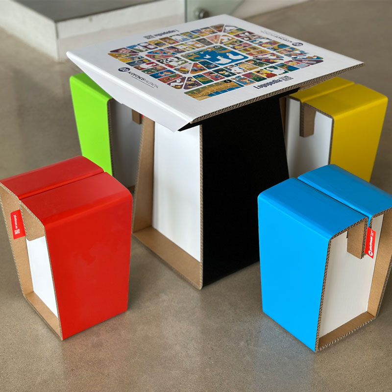 Diseño y desarrollo de mesa impresa Plottkit play, con cuatro taburetes de colores.